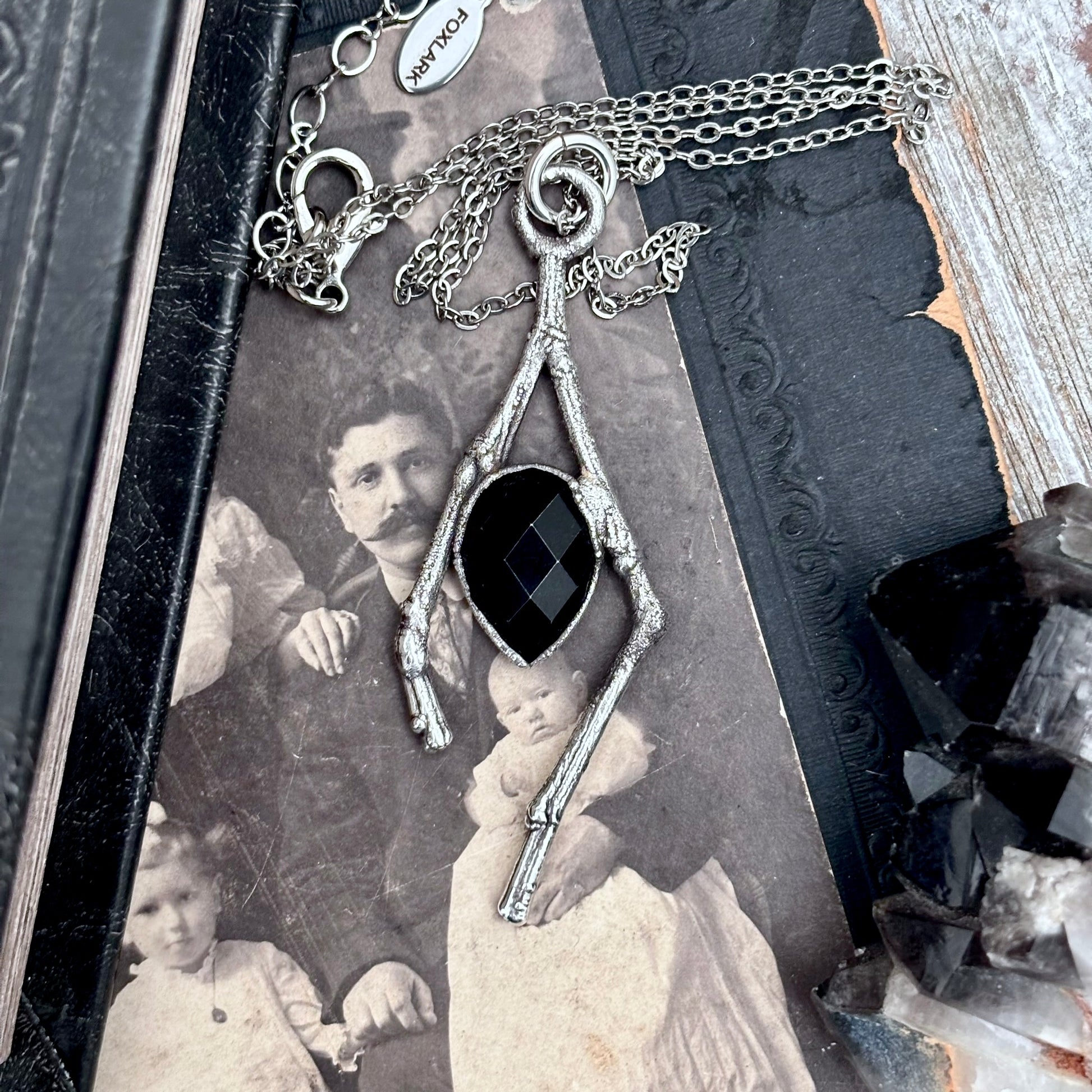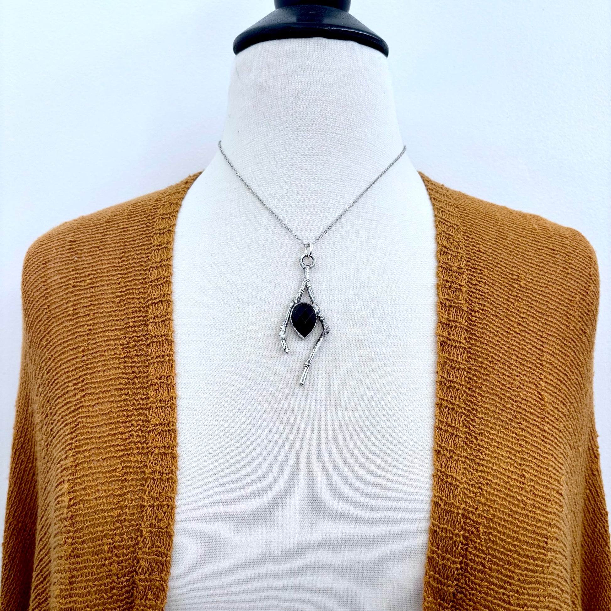 Earthy, layered, and full of natural magic—this fine silver necklace frames black onyx in hand-formed twigs, capturing the grounding beauty of the earth in a striking crystal statement piece.