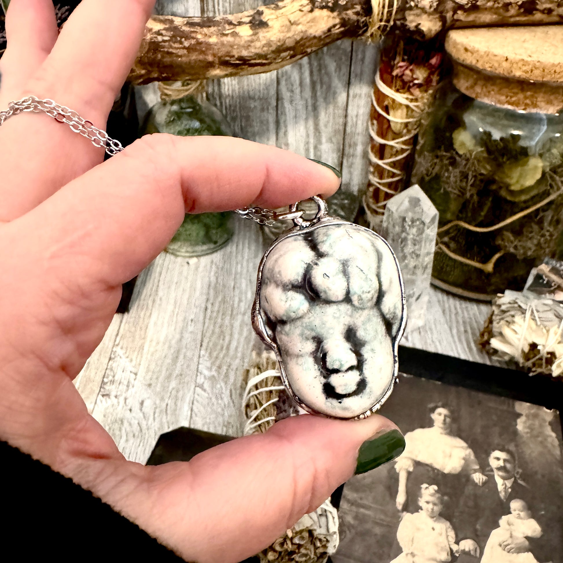 Get in touch with our contact page or you can always contact us on our FOXLARK Instagram www.instagram.com/foxlark or Facebook pages www.Facebook.com/foxlark , or through email foxlarkalchemy@gmail.comCeramic baby doll face set in fine silver and given a vintage patina turning it into a unique statement necklace. This handmade necklace is perfect worn alone or layered with other pieces.