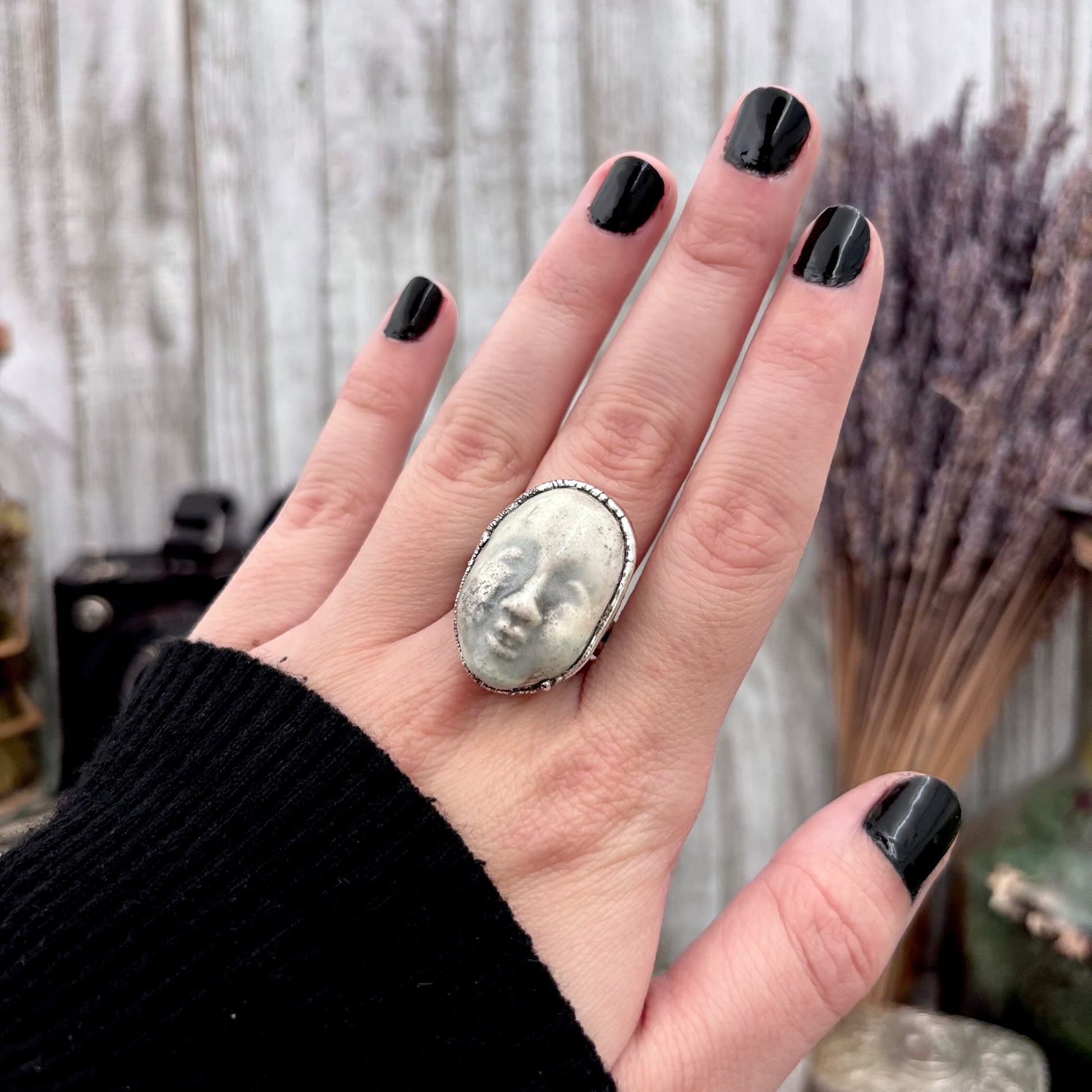 Get in touch with our contact page or you can always contact us on our FOXLARK Instagram www.instagram.com/foxlark or Facebook pages www.Facebook.com/foxlark , or through email foxlarkalchemy@gmail.comCeramic baby doll face set in fine silver and given a vintage patina turning it into a unique statement ring. This handmade ring is perfect worn alone or layered with other pieces.