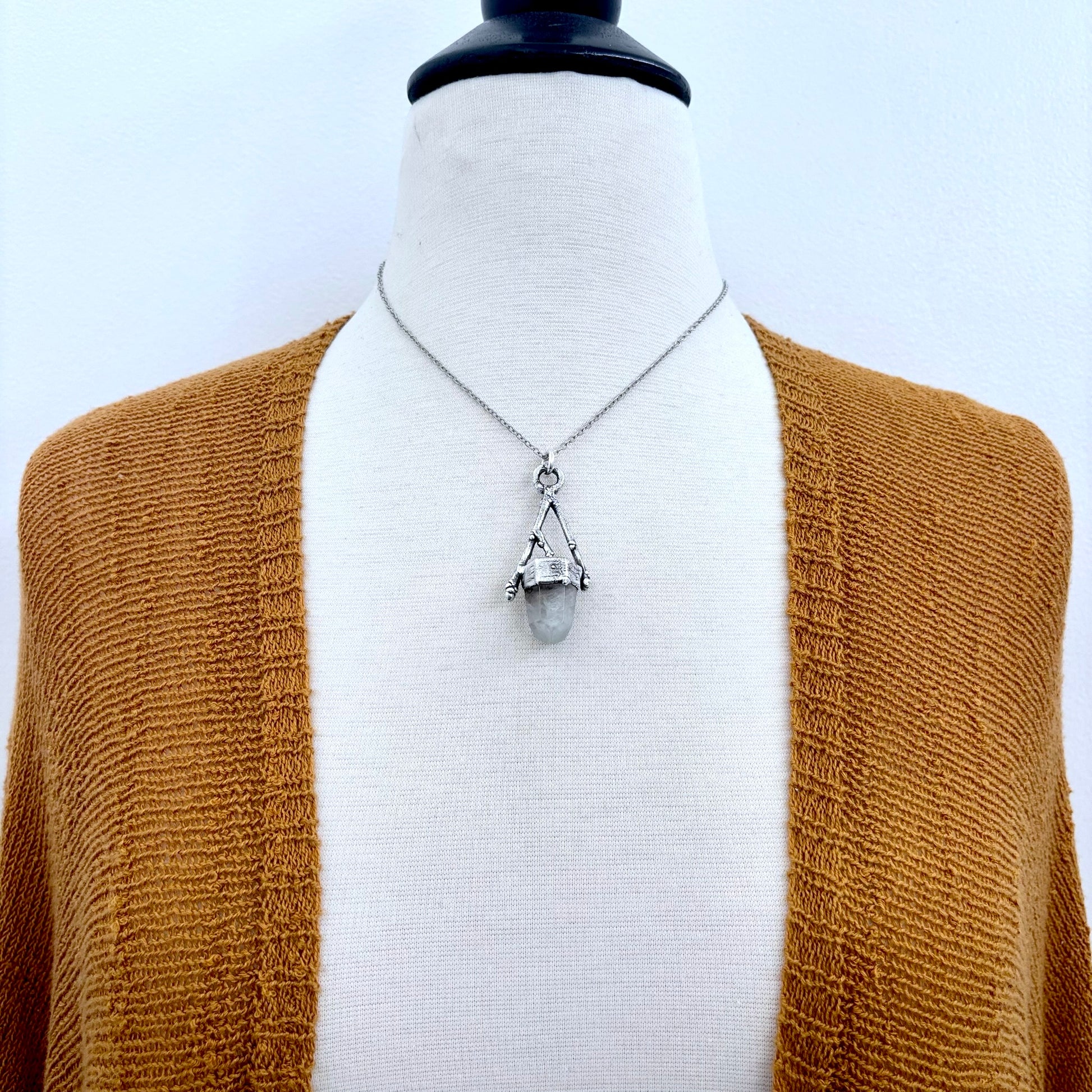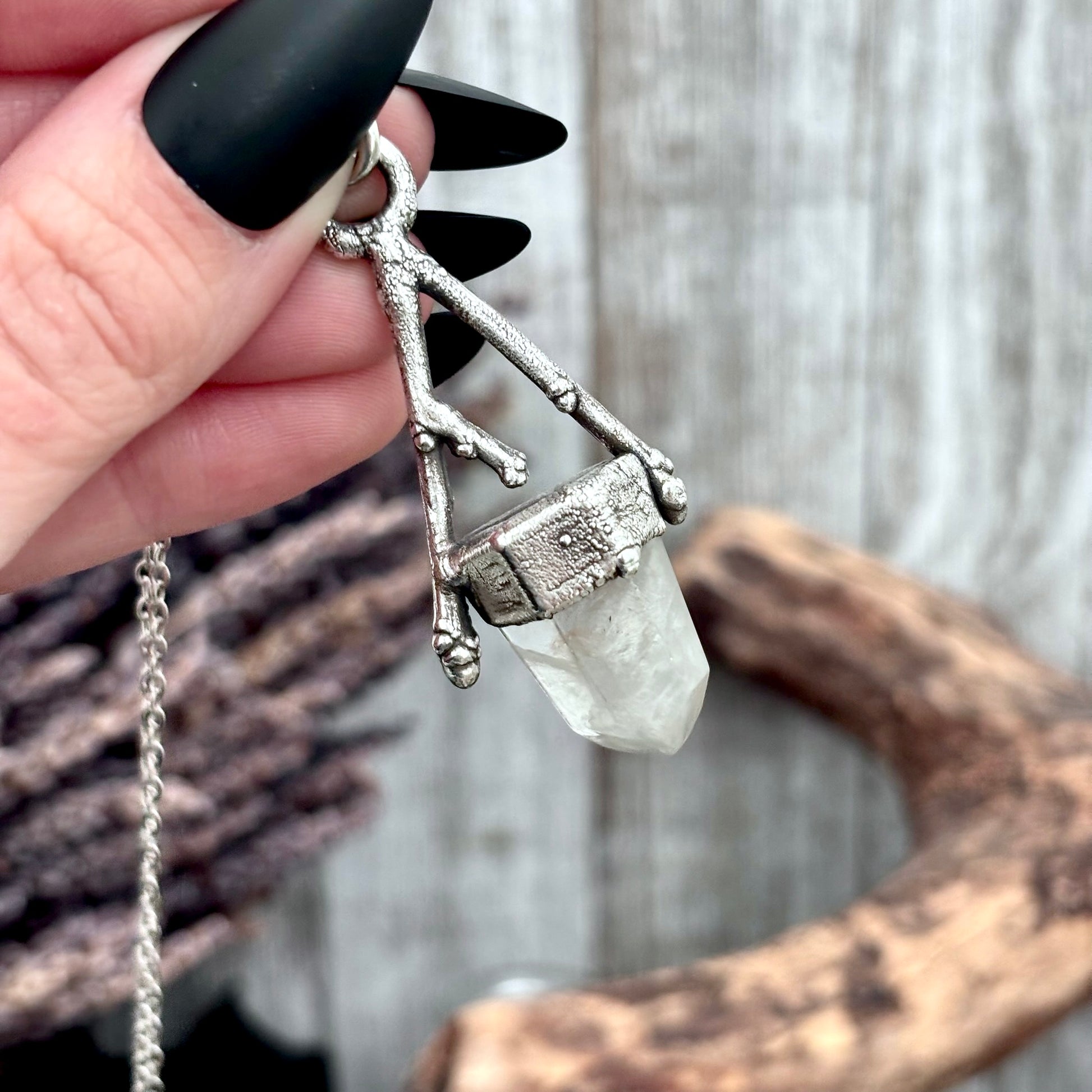 Earthy, layered, and full of natural magic—this fine silver necklace frames garden quartz in hand-formed twigs, capturing the grounding beauty of the earth in a striking crystal statement piece.