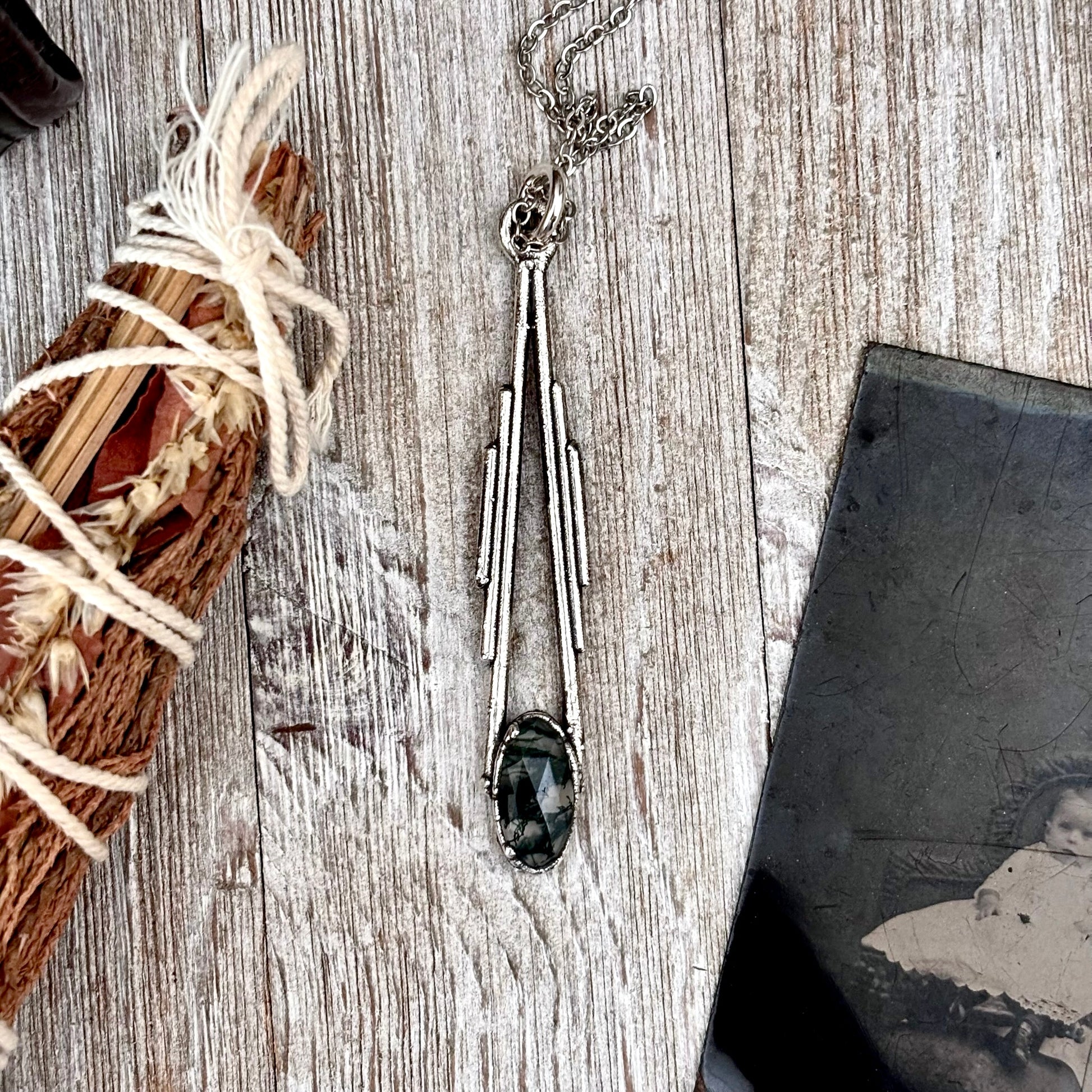 Moss agate set in fine silver and given a vintage patina turning it into a unique crystal statement necklace. This handmade crystal necklace is perfect worn alone or layered with with other pieces.