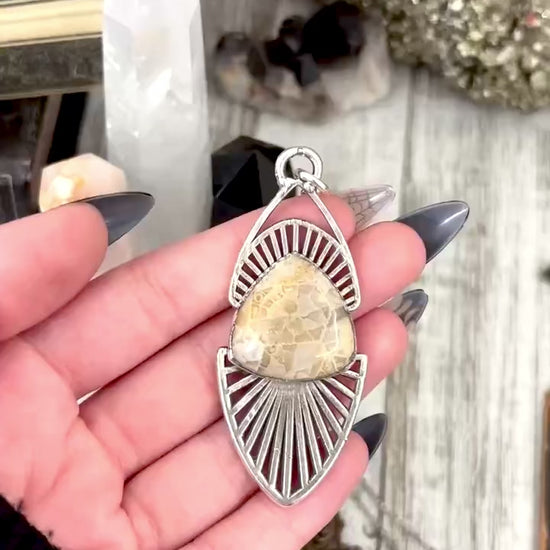 Get in touch with our contact page or you can always contact us on our FOXLARK Instagram www.instagram.com/foxlark or Facebook pages www.Facebook.com/foxlark , or through email foxlarkalchemy@gmail.comFossilized Coral set in fine silver and given a vintage patina turning it into a unique crystal statement necklace. This handmade crystal necklace is perfect worn alone or layered with with other pieces.