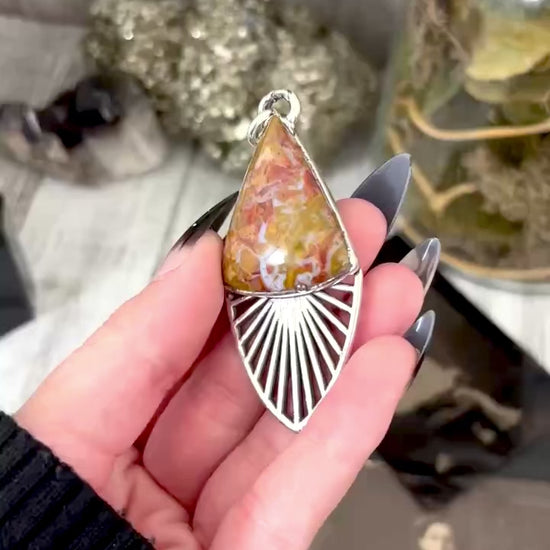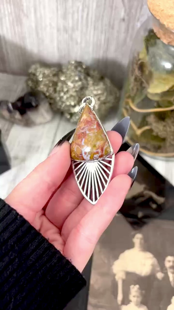 Petrified Wood set in fine silver and given a vintage patina turning it into a unique crystal statement necklace. This handmade crystal necklace is perfect worn alone or layered with with other pieces.