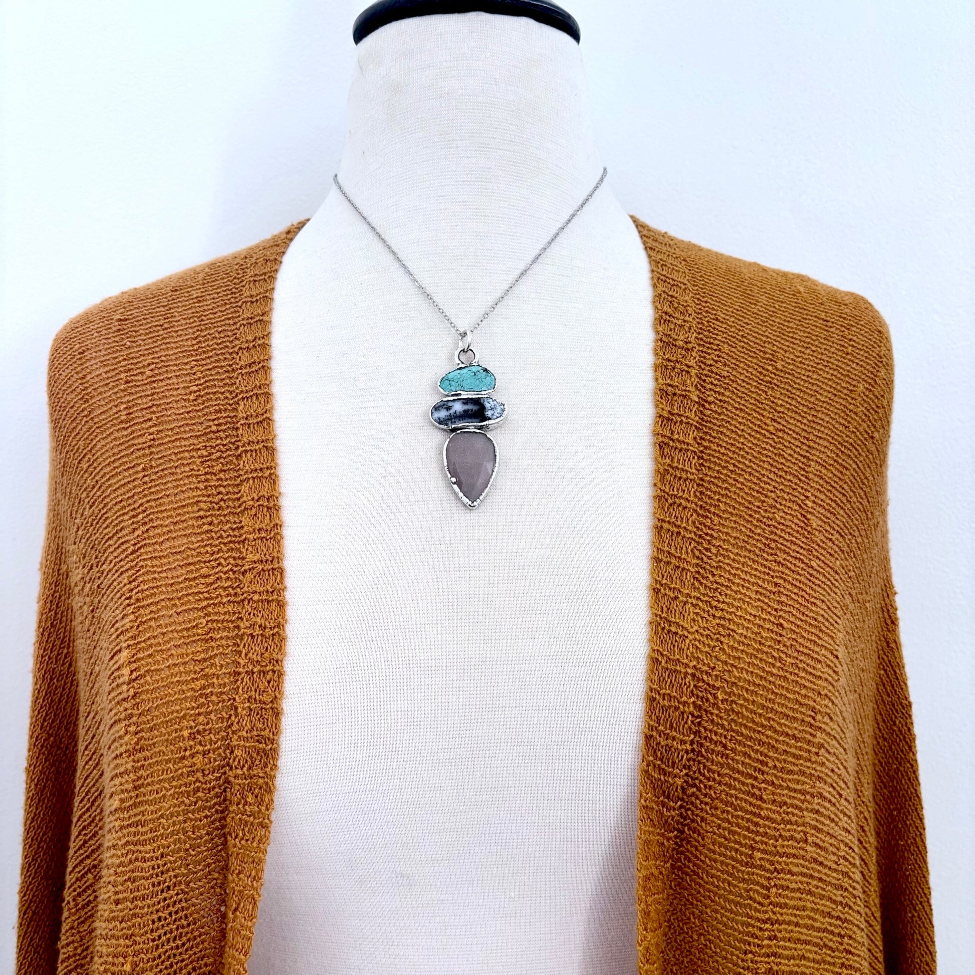 Multi Stone Turquoise Dendritic Agate Peach Moonstone Crystal Necklace Fine Silver / Foxlark Collection