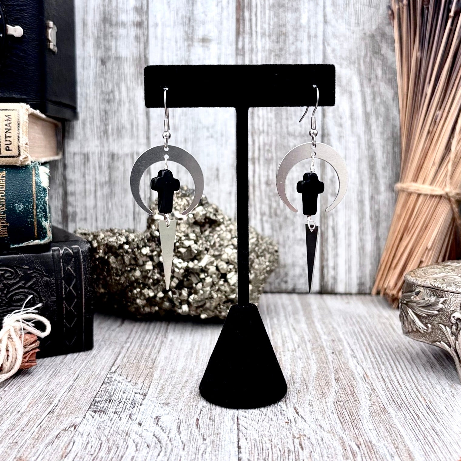 Stainless Steel Black Cross Earrings / Long Dangle Earrings