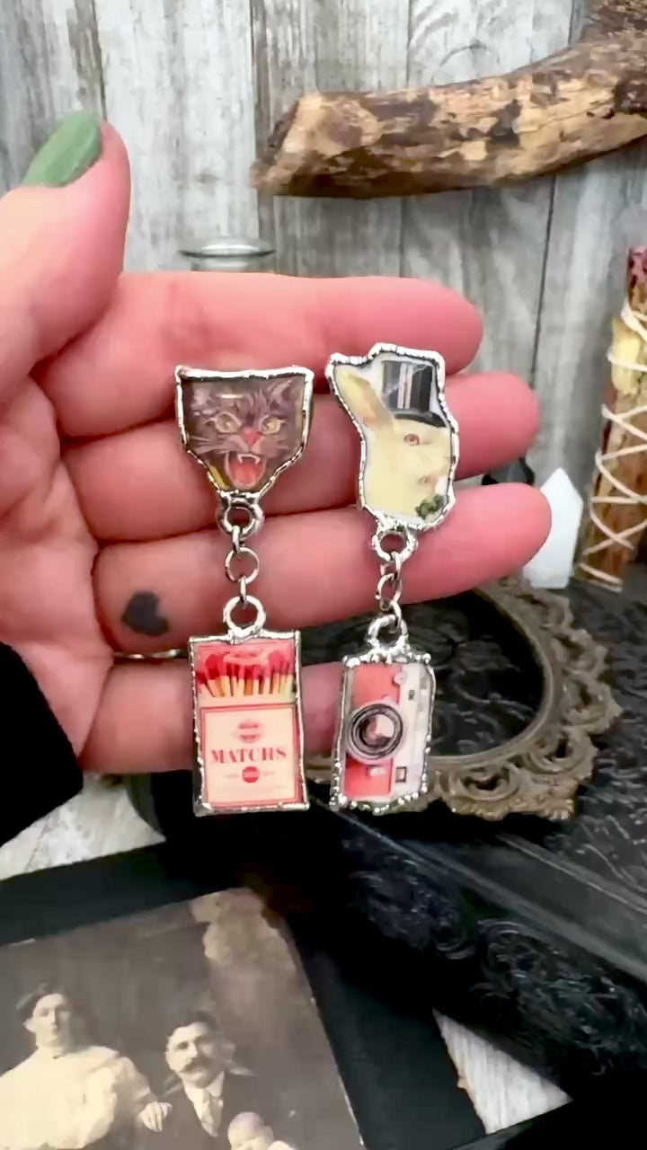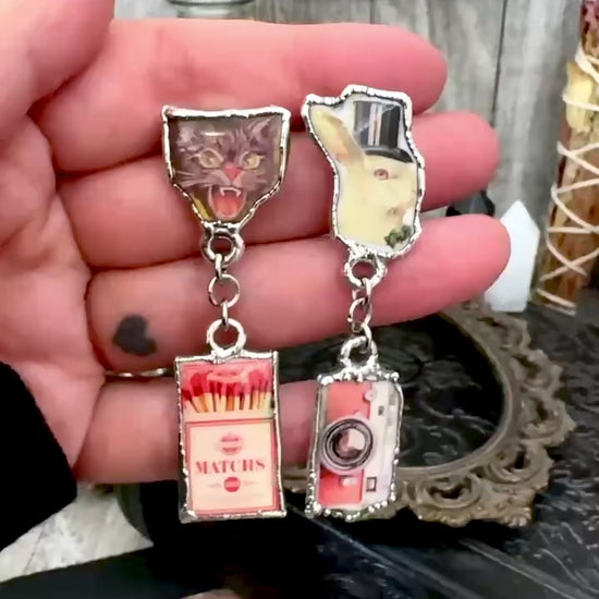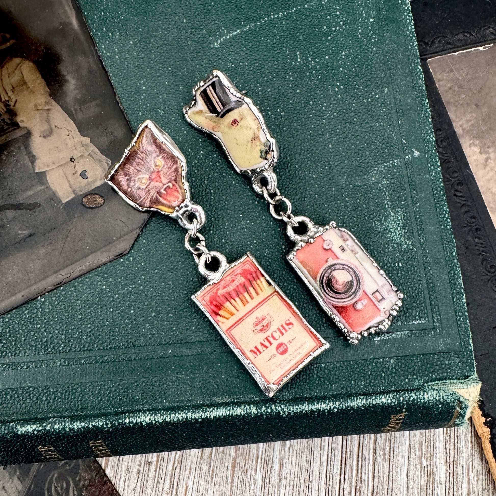 Mismatch Long Fine Silver Earrings - Vintage Cat, Matchbox, Rabbit and Camera / One of a Kind