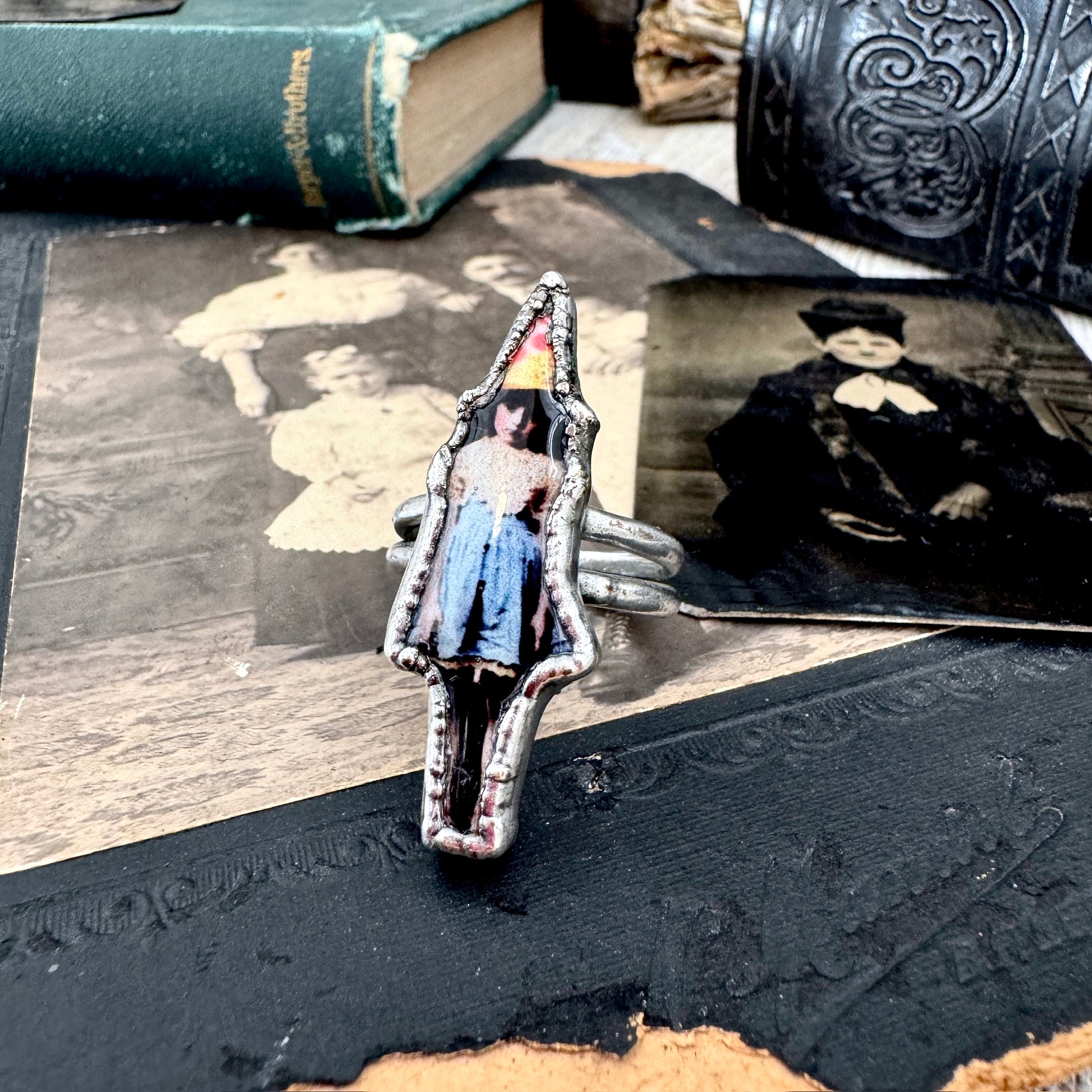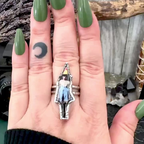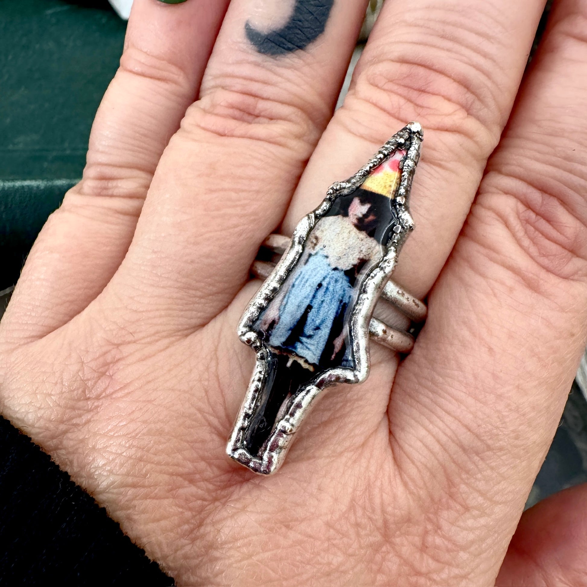 The Weirdlings Collection - Resin sealed printed wooden cabochon set in fine silver and given a vintage patina turning it into a unique statement ring. This handmade ring is perfect worn alone or layered with other pieces.